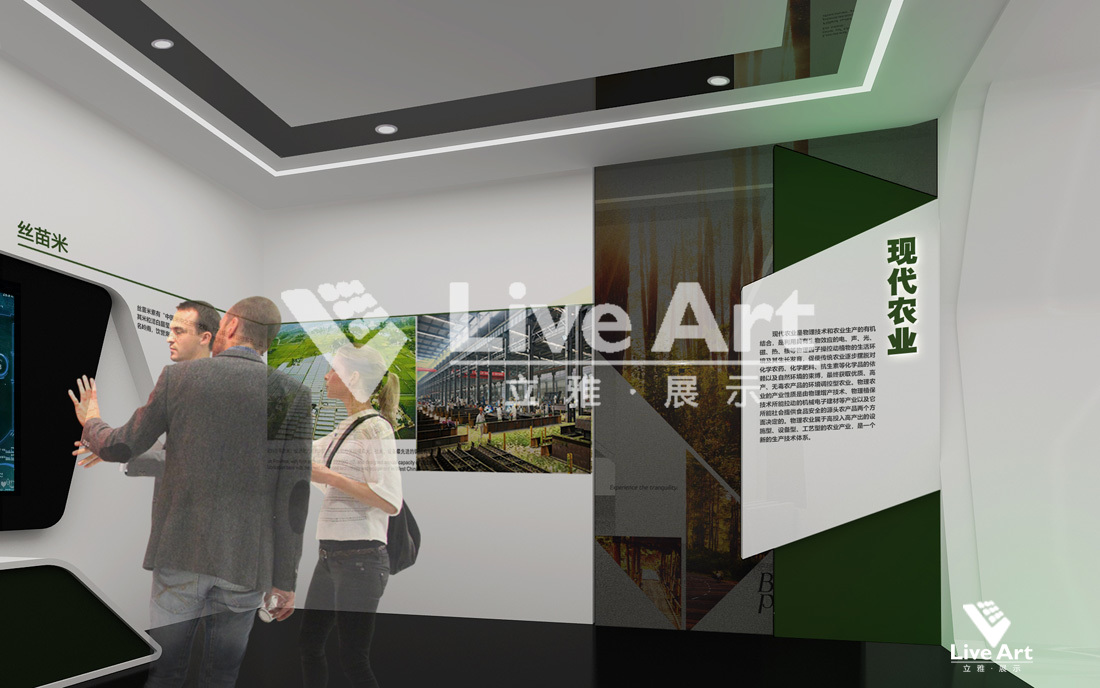 广东省农业科创中心展厅是个科普展厅,旨在向群众推广现代农业种植技术,关推广农产品,因此展厅里设置了VR体验区,科普问答等多种互动装置,让观众切身体验农产品的种植过程,并感受现代科技下的农业种植;设置农产品体验区,并与电商合作,加上5G概念,让观众可以看到实际的产品的同时,也可以通过扫码购买农产品。